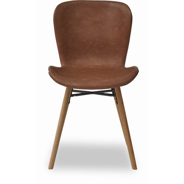 matstol, ej stapelbar, maxbelastning 110 kg och siddehøjde 48 cm. – Konjakfärgat konstläder och ben i oljebehandlad ek