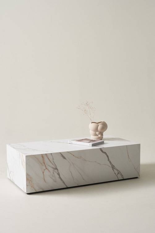 Rektangulärt soffbord av FSC-certifierad MDF som klätts med naturnära marmorimitation. Det snygga bordet har många fördelar jämfört med äkta marmor. Det är tåligare än marmor, vikten är hanterbar och priset kan inte jämföras. Soffbordet har små tassar under som ger en liten luftspalt mellan bordet och golvet och bordet får en svävande känsla. I ANZIO får du ett ljust, fräscht soffbord som är både snyggt och praktiskt. Produkten är certifierad med FSC vilket innebär att den består av trä som är avverkat från ett ansvarsfullt skogsbruk som tar hänsyn till människor och miljö. Material: MDF och marmorimitation. Storlek: Höjd 35 cm, bordsskiva 60×120 cm. Maxvikt: 100 kg. Skötselråd: Torkas av med lätt fuktad trasa. Tips/råd: ANZIO finns också i ett mindre sidobord om du vill komplettera med ett bord bredvid soffan, då passar det helt perfekt.