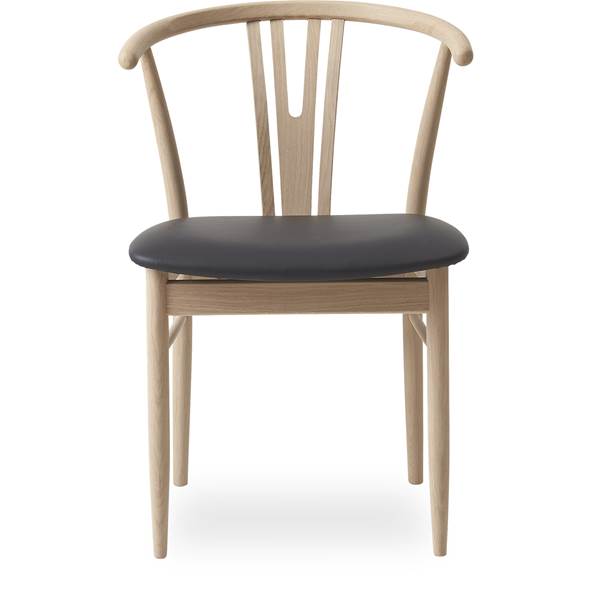 matstol, med armstöd, maxbelastning 100 kg och siddehøjde 45 cm. – Sits i svart läder och stomme i obehandlat ek