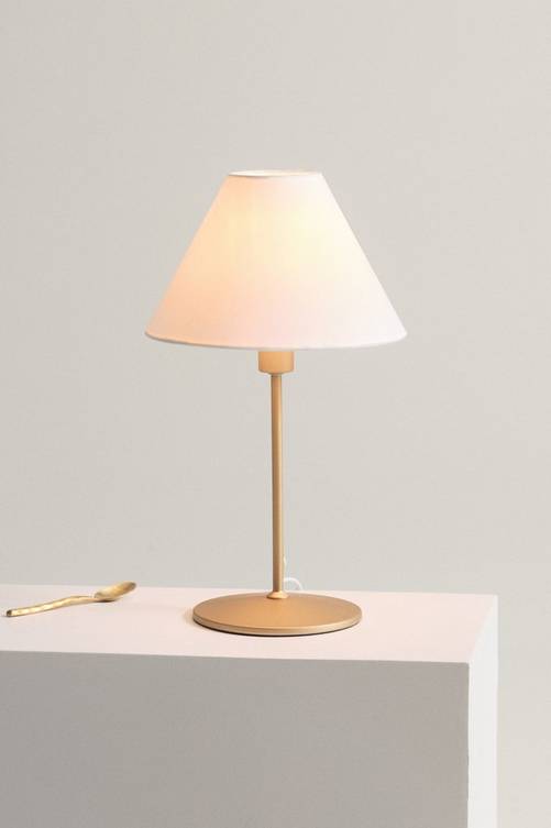 Bordslampa med slät, stilren textilskärm och fot av guldfärgad metall. Bordslampan ASTA är lätt att placera och passar in i de flesta stilar med sin enkelhet. Vit sladd med strömbrytare på sladden. Material: Fot: metall. Skärm: 65% polyester och 35% bomull, stomme av metall. Storlek: Höjd 40 cm. Skärm: Höjd 14 cm, ø 23 cm. Sockel/lampa: 1 st E14, LED max 5 w. Ljuskälla medföljer ej. Tips/råd: Vi rekommenderar ljuskällan Filament dekorationslampa LED dimbar klot, 1622944-01 / 1622944-02.