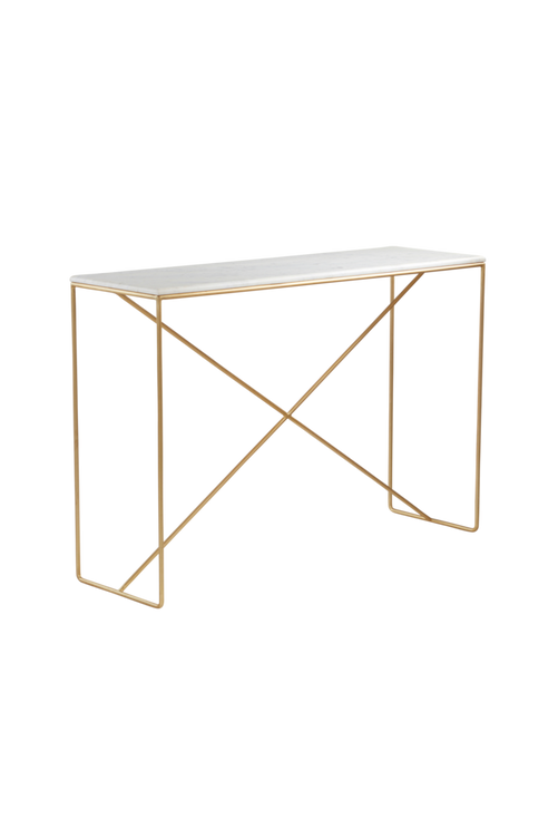 Sidobord av metall med bordsskiva av marmor. Det dekorativa mötet med benen gör att det annars avskalade bordet får en vacker detalj. Marmor är en natursten och mönstret varierar alltid lite beroende på bergartens sammansättning, vilket gör varje möbel unik. Material: Marmor och metall. Storlek: Höjd 76 cm, bordsskiva 35×110 cm. Skötselråd: Torkas av med lätt fuktad trasa och ibland rengöring med såpvatten. Eftertorka ytan med en mjuk trasa eller handduk. Marmor är ett poröst material som lätt absorberar vätska. Undvik vätskor med starka färgämnen och/eller syra (citron, kolsyra, vinäger, vin, kaffe osv). Det lämnar permanenta fläckar. Torka omedelbart upp utspilld vätska. Skydda din möbel regelbundet med marmorolja. Tips/råd: ATHENA inbjuder till kreativ placering, varför inte under spegeln i hallen, som sminkbord i sovrummet eller sideboard i köket.