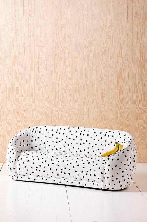 Rundad minisoffa för barn med klädsel i lekfullt prickigt tyg av polyester och en stabil stomme av furuträ och plywood. Soffan har god sittkomfort tack vare sin fantastiska uppbyggnad av kallskum, zickzackfjädring och resårkärna. AUSTIN DOT MINI är en miniversion av vår populära soffa AUSTIN. Den är minst sagt speciell och en alldeles underbar barnsoffa som med sin runda form sticker ut, utan att ta för mycket plats. Soffan kan placeras fritt i rummet, vilket skapar luftiga, intressanta barnmiljöer och passar perfekt i både tjej- och killrummet. Material: 100% polyester och trä. Storlek: Höjd 52 cm, bredd 132,5 cm, djup 50 cm. Skötselråd: Dammsugning. Formgivare: Jotex Design Studio.