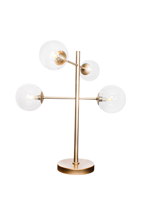 Denna bordslampa av metall, är pampig och stilren på samma gång. Den mattguldiga färgen inger en lyxig känsla medan de ställbara armarna med glaskulor gör lampan dynamisk och framträdande. Armarna är ställbara vilket gör att du kan justera dem för att exempelvis kunna placera lampan i ett fönster. Som mest är längden mellan armarna 52 cm. Höjden på lampan är 50 cm och diametern på foten är 16 centimeter. Till bordslampan behöver du 4 ljuskällor med sockel G9 och på den två meter långa transparenta sladden sitter en dimmer vilket gör att du kan dra upp och ned på ljusstyrkan utefter tycke och smak. Ljuskällor ingår ej.