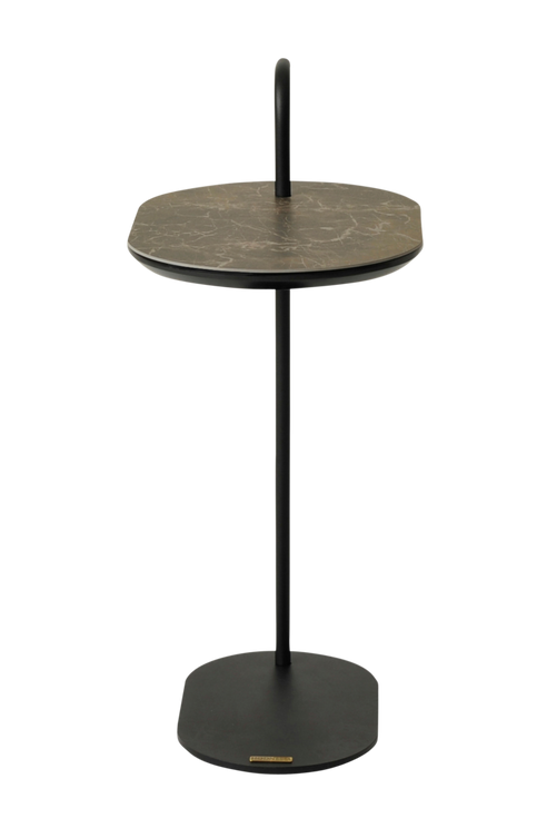 Praktiskt avlastningsbord. Topp i keramik som har en fin marmorlook. Underrede och handtag i lackerad metall. Bredd 28 cm, djup 40 cm och höjd 62 cm. Omonterad.