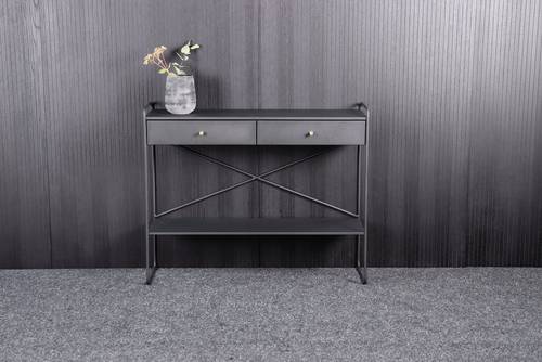 Modernt sidobord i metall. Sidobordet har två lådor för att förvara småsakerna du inte vill ha framme. Lådorna öppna med en elegant mässingsknopp.