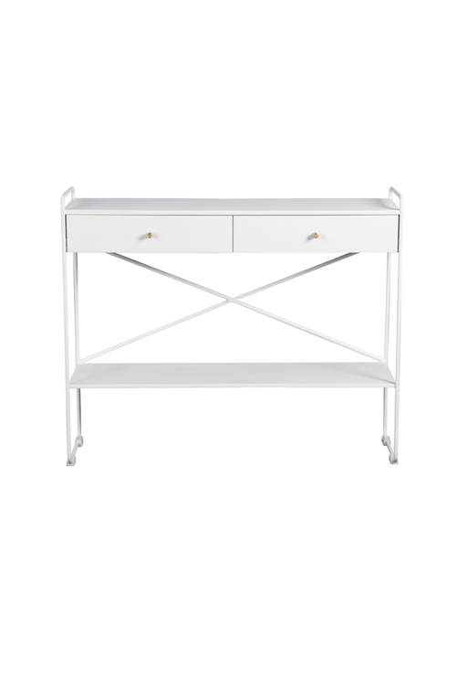 Modernt sidobord i metall. Sidobordet har två lådor för att förvara småsakerna du inte vill ha framme. Lådorna öppna med en elegant mässingsknopp.