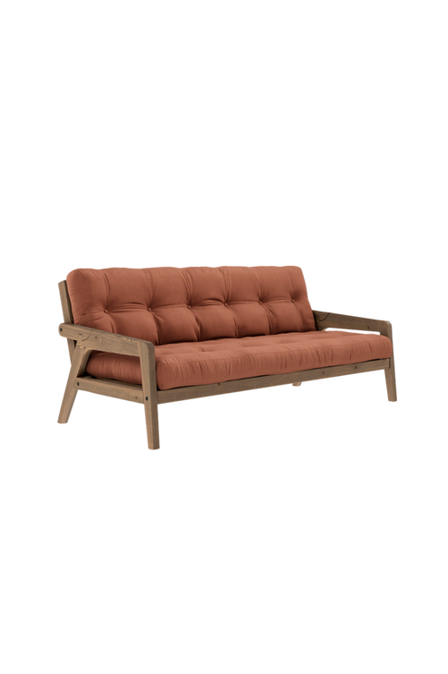 Dela . Omvandla . Grab bäddsoffa är gjord för att dela. Både som soffa och som dubbelsäng när den är utfälld. Armstöden är designade för att enkelt kunna omvandlas och fungera som dubbelsängens bakben genom att vända den – vilket är den enklaste förvandlingen från soffa till säng hittills. En bekväm futonmadrass ingår. Designad av Says Who för Karup Design.