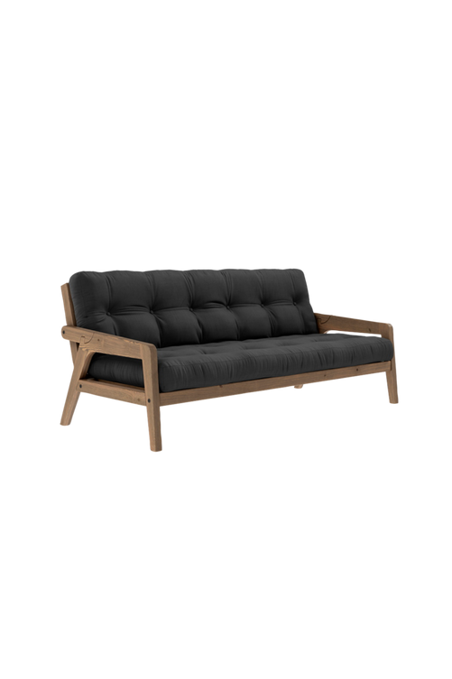 Dela . Omvandla . Grab bäddsoffa är gjord för att dela. Både som soffa och som dubbelsäng när den är utfälld. Armstöden är designade för att enkelt kunna omvandlas och fungera som dubbelsängens bakben genom att vända den – vilket är den enklaste förvandlingen från soffa till säng hittills. En bekväm futonmadrass ingår. Designad av Says Who för Karup Design.