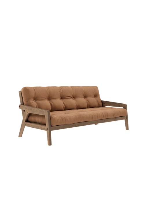 Dela . Omvandla . Grab bäddsoffa är gjord för att dela. Både som soffa och som dubbelsäng när den är utfälld. Armstöden är designade för att enkelt kunna omvandlas och fungera som dubbelsängens bakben genom att vända den – vilket är den enklaste förvandlingen från soffa till säng hittills. En bekväm futonmadrass ingår. Designad av Says Who för Karup Design.