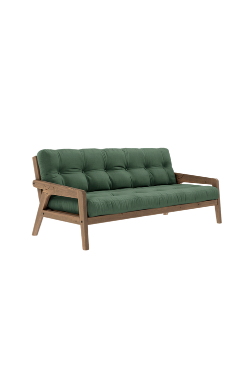 Dela . Omvandla . Grab bäddsoffa är gjord för att dela. Både som soffa och som dubbelsäng när den är utfälld. Armstöden är designade för att enkelt kunna omvandlas och fungera som dubbelsängens bakben genom att vända den – vilket är den enklaste förvandlingen från soffa till säng hittills. En bekväm futonmadrass ingår. Designad av Says Who för Karup Design.