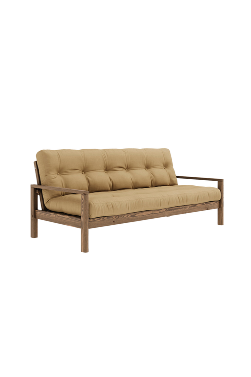 Lätt . Att . Förvandla Knob sticker ut från våra andra bäddsoffor med sin vackra elegans. Den är elegant, nätt och ger inredningen en lätt känsla, samtidigt som den är användarvänlig och funktionell. Under båda armstöden finns en knapp som enkelt skruvas loss för att förvandla den moderna soffan till en bekväm säng för antingen dig själv eller dina övernattande gäster.