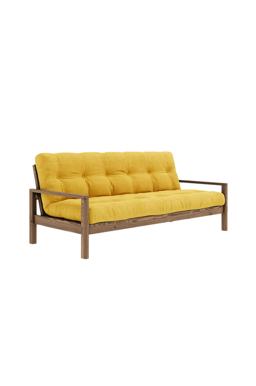 Lätt . Att . Förvandla Knob sticker ut från våra andra bäddsoffor med sin vackra elegans. Den är elegant, nätt och ger inredningen en lätt känsla, samtidigt som den är användarvänlig och funktionell. Under båda armstöden finns en knapp som enkelt skruvas loss för att förvandla den moderna soffan till en bekväm säng för antingen dig själv eller dina övernattande gäster.