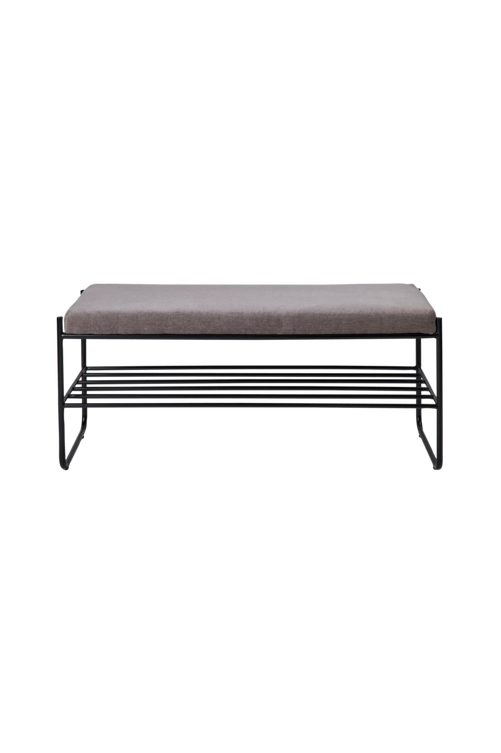 Hallbänk med förvaringshylla. Stoppad sitsdyna i tyg. Lackad metallstomme. Levereras omonterad.