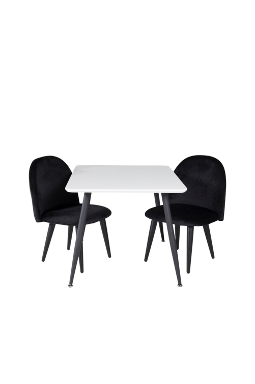 Penally barnmöbelgrupp med ett petit vackert bord med vitmålad MDF topp och svartlackerade bordsben i metall. Bordets mått: Längd: 80cm. Bredd: 60cm. Höjd: 51cm. Matchas med två stycken vackra små stolar. Mått stol: Bredd: 40cm. Höjd: 60cm. Djup: 42cm. Höjd: 31.5cm. Bordet och stolarna kräver enklare montering.