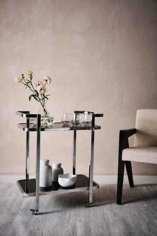 Serveringsvagn av metall med kromad yta och svart glas. Vagnen har snygga små hjul som gör den praktisk att flytta. Användningsområdet är brett och du kan ha den både som avlastningsbord eller sidobord. Material: Glas och metall. Storlek: Höjd 77 cm, bredd 65 cm, djup 42 cm. Skötselråd: Torkas av med lätt fuktad trasa och glasputs. Formgivare: Jotex Design Studio.