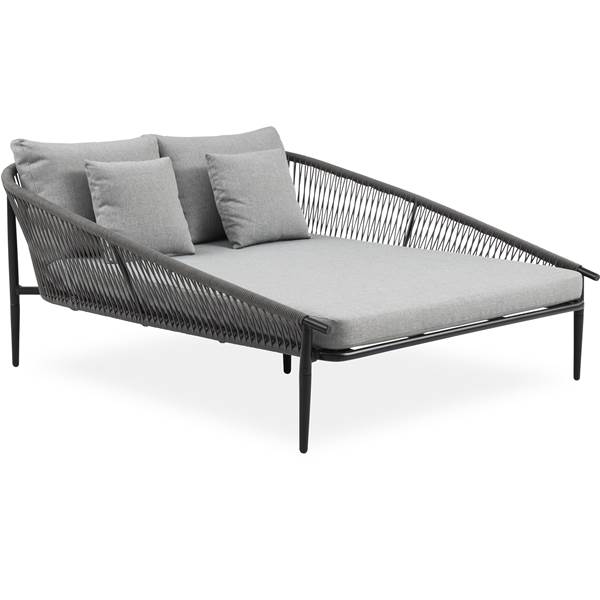2 sits Solsäng, och max. belastning 320 kg. – Grått polyesterrep, stomme i antracit pulverlack. alu. och dynor i ljusgrå polyester