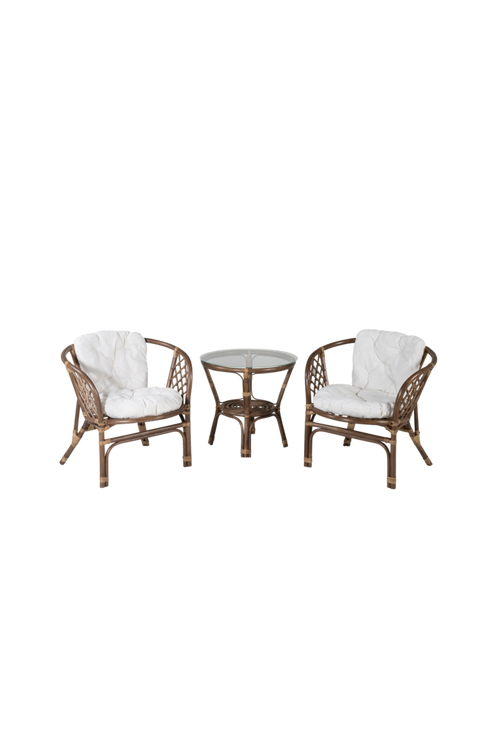 Wonka bistro set i honungsfärgad rotting och en bordsskiva i klarglas. Setet består av 1 bord och 2 tillhörande stolar med kuddar i offwhite. Bordets mått: Höjd 56 cm. Diameter 60. Stolens mått: Höjd: 72 cm. Bredd: 71 cm. Djup: 69 cm. Sitthöjd: 45 cm. Sittdjup 53 cm. Max viktbelastning 160 kg. Ingen montering krävs.