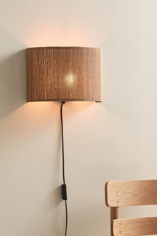 Vägglampa i enkel och stilren modell med rak, halvrund lampskärm av bambu som ger lampan en mjukare karaktär. Lampskärmens insida är av frostad pvc som reflekterar ljuset. Stommen är av pulverlackerad metall. Svart sladd med strömbrytare på sladden. Material: Bambu, pvc och metall. Storlek: Höjd 20 cm, bredd 30 cm, djup 15 cm. Sockel/lampa: 1 st E27, LED max 5. Ljuskälla medföljer ej. Tips/råd: Vi rekommenderar filament dekorationslampa LED dimbar 4 w, 1622940-01 eller 1622941-01.