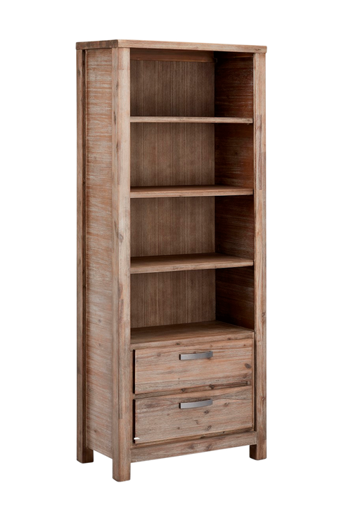 Bokhylla i akacia med 3 hyllplan och 2 lådor. Bokhyllan levereras färdigmonterad Mått (cm): B: 80 D: 40 H: 200 Vikt: 36 kg Antal hyllor / lådor: 2 lådor / 3 hyllor Benhöjd (cm): 6 Hylltjocklek (mm): 20 Material: Massiv akacia och hyllplan i MDF med akaciafanér Skötselinstruktioner: Behandla ytan med en klar möbelolja en gång per år