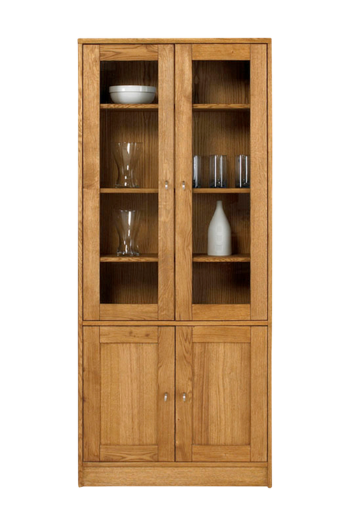 Bokhylla bred vitrin i oljad ek. Bredd 80 cm. Djup 33 cm. Höjd 187 cm. Vikt 60 kg.