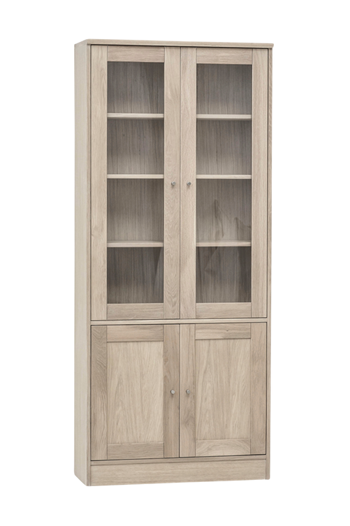 Bokhylla bred vitrin i vitoljad ek. Bredd 80 cm. Djup 33 cm. Höjd 187 cm. Vikt 60 kg.
