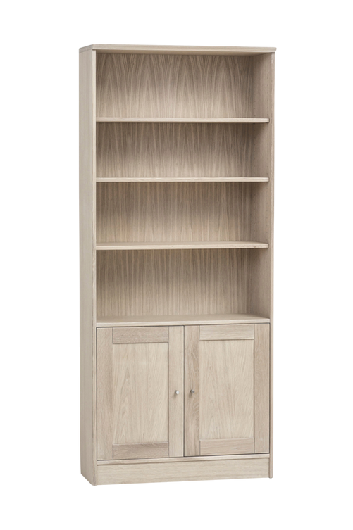Bokhylla bred öppen/trädörrar i vitoljad ek. Bredd 80 cm. Djup 33 cm. Höjd 187 cm. Vikt 48 kg.