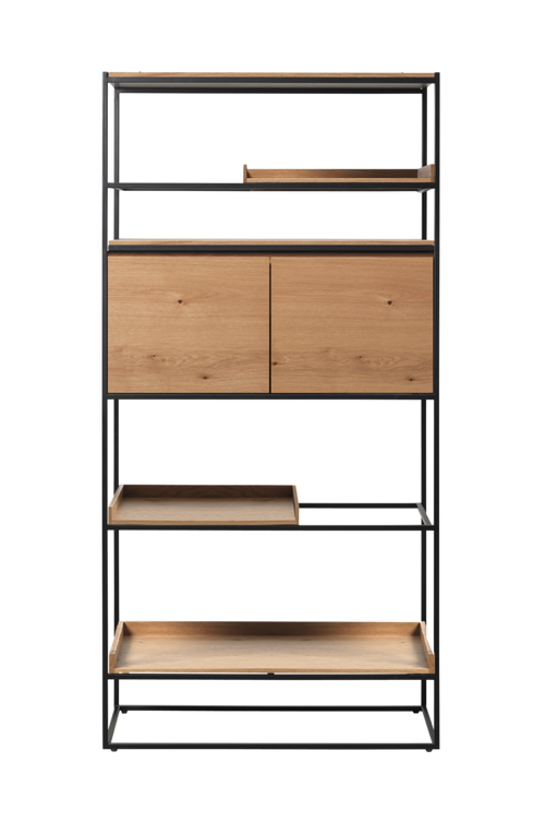 En fyrkantig, luftig, svart metallstomme står i kontrast till mörk, rökig ekfaner som framhävs av en lätt borstning och inbyggda handtag. Kollektionen Lindköping, i industristil med en minimalistisk, modern silhuett, passar in i varje kök, vardagsrum eller matsal.