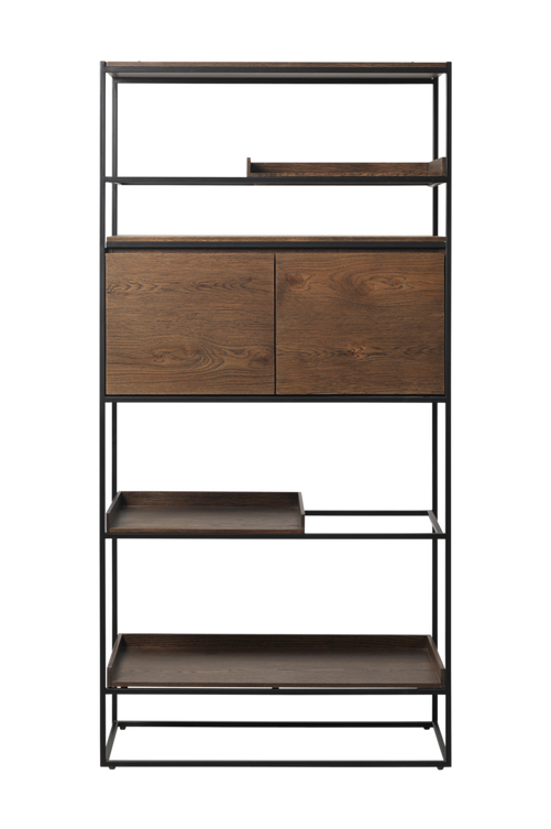 En fyrkantig, luftig, svart metallstomme står i kontrast till mörk, rökig ekfaner som framhävs av en lätt borstning och inbyggda handtag. Kollektionen Lindköping, i industristil med en minimalistisk, modern silhuett, passar in i varje kök, vardagsrum eller matsal.