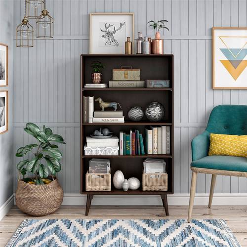 Bokhyllan Brittany 4 Shelf Bookcase från Novogratz skapar en modern retrokänsla i vardagsrummet eller hemmakontoret. Möbelns vackra träfaner med valnötsfinish ser ut och känns som riktigt trä och passar perfekt ihop med de vinklade träbenen. Organisera dina favoritböcker eller visa upp dina samlingar på de fyra hyllplanen. Med den här bokhyllan kommer du enkelt åt dina saker och adderar en minimalistisk touch i rummet. Ett kit för att fästa möbeln säkert i väggen medföljer. Bokhyllan levereras i ett platt paket och kräver montering. Vi rekommenderar att två vuxna monterar produkten. Monterad mäter bokhyllan H139 x B80 x D30 cm.