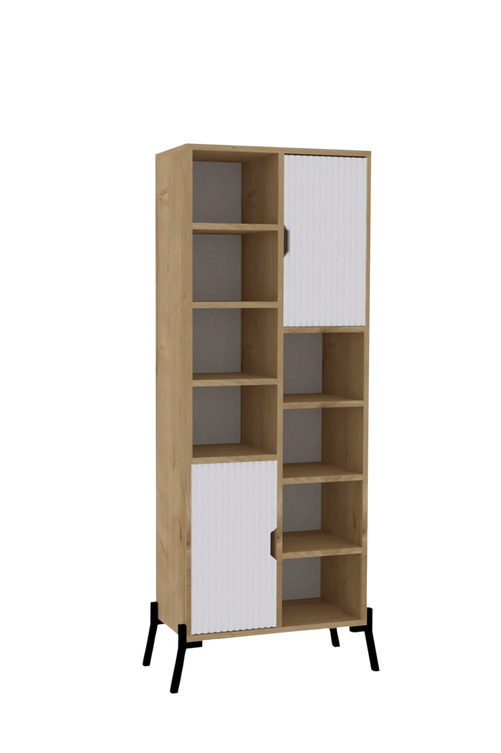 100% SPÅNSKIVA MED MELAMINBELÄGGNING Tjocklek: 1,8 cm Dörr med beläggning av MDF-membran Ben av järn Bredd: 58,6 cm Höjd: 160 cm Djup: 30 cm Flera hyllplan Extra förvaringsutrymme