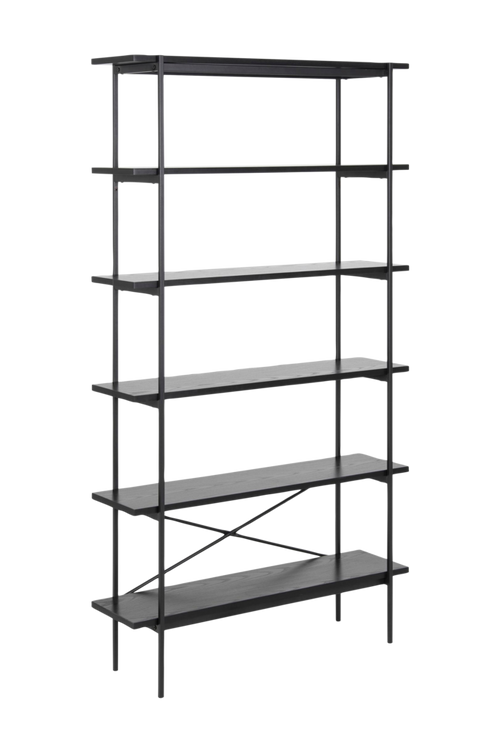 Bokhylla med rena linjer och en lätt struktur, som är ett modernt tillskott i alla hem. De fem hyllplanen av svart ask ger utmärkt förvaringsutrymme. De robusta, pulverlackerade metallbenen ger en komplett stil. Den mycket mångsidiga och moderna vägghyllan är packad i platta paket för enkel transport.