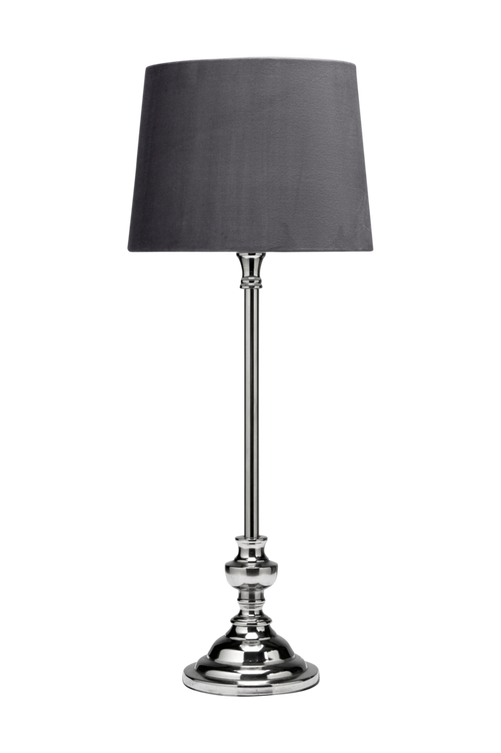 Bordslampa Andrea med Sofia sammetsskärm. Höjd fot 43 cm, bredd 11,5 cm. E27, max 40W. Skärm höjd 15,5 cm, diameter 20,5/17,5 cm. Ringfäste E27. Total höjd 51 cm. Ljuskälla ingår ej.