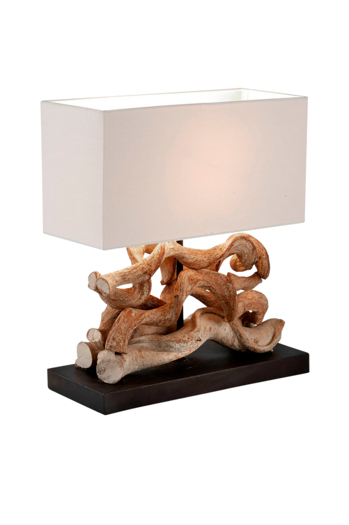 Bordslampa av återvunnet tropiskt trä och lampskärm av vit bomullstextil. Glödlampa E27 60W (medföljer ej).