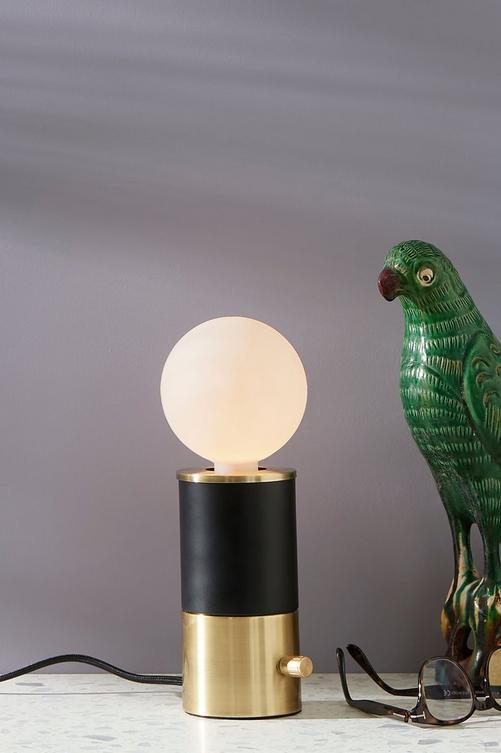 Stilren bordslampa i metall med mattsvart mellandel. Nederdelen och "locket" är i antikmässingfinish. Mått: Höjd 16 cm, bredd 8 cm, djup 8 cm. Svart textilsladd med väggkontakt, sladdlängd 200 cm. Strömbrytare på lampfoten. Stor sockel E27. Ljuskälla max 60 W eller motsvarande i LED, Halogen eller annan lågenergilampa. Ljuskälla ingår ej. Olika typer av ljuskällor kan ha stor påverkan på stil och utseende hos lampan. Prova dig fram till ditt eget uttryck!
