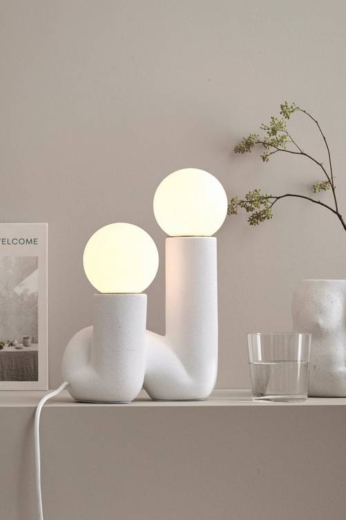 Bordslampa av keramik med sandig struktur och plats för 2 ljuskällor. Textilsladd med strömbrytare. Ljuskällor ingår ej. Större ljuskällor med diameter 95 mm och sockel E27 rekommenderas. Olika typer av ljuskällor kan ha stor påverkan på stil och utseende hos lampan. Prova dig fram till ditt eget uttryck!