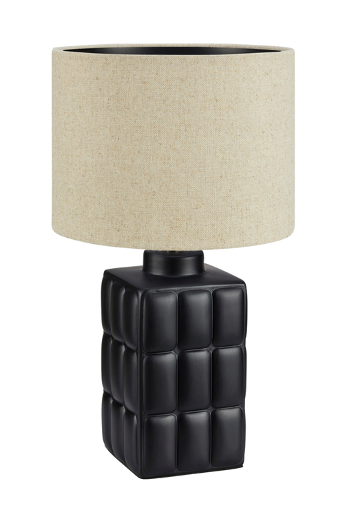 Bordslampan Cuscini från Markslöjd har en bas i keramik med skärm i linne. Den har en 200 cm lång textilkabel med strömbrytare på sladden och stickkontakt. Ljuskälla ingår ej.