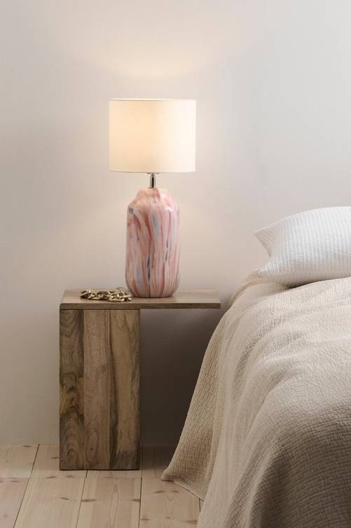 Bordslampa med fot av munblåst glas och skärm av bomullstextil. Totalmått: Höjd 50 cm, diameter 22 cm. Skärmens mått: Höjd 18 cm. diameter 22 cm. Lampfotens mått: Höjd 28 cm, diameter 15 cm. Transparent sladd med strömbrytare. Ljuskälla ingår ej.