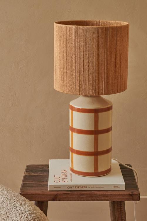 Bordslampa med fot av glaserad, rutmönstrad keramik och skärm av papperstrådar. Vit textilsladd med strömbrytare. Skärmens mått: Höjd 22 cm. djup 25 cm. Lampfotens mått: Höjd 36 cm, djup 15 cm. Ljuskälla ingår ej.