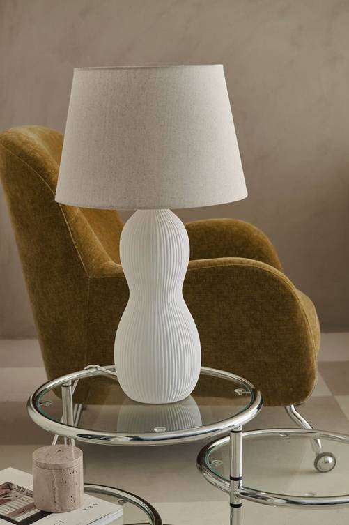 Bordslampa med fot av matt keramik med organisk form i lätt ribbstruktur. Textilskärm. Mått på skärmen: Höjd 23 cm, diameter toppen 26 cm, diameter botten 35 cm. Mått på lampfoten: Höjd 37 cm, diameter som störst 16 cm. Vit textilsladd med strömbrytare. Ljuskälla ingår ej.