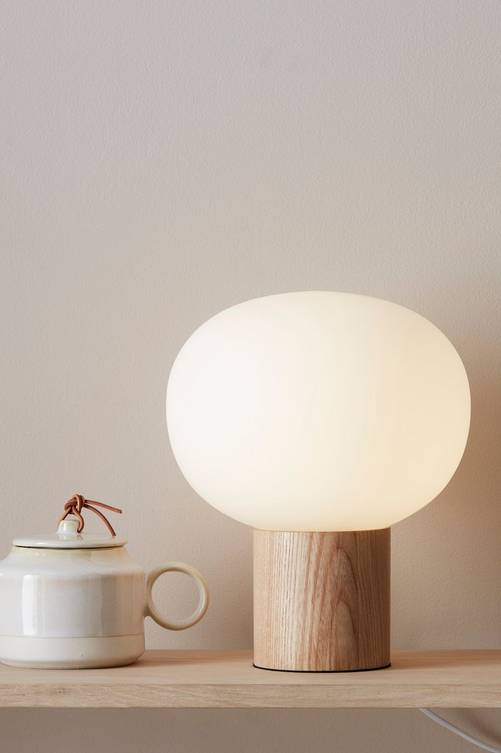 Bordslampa med fot i oljad solid ask och mattvitt opalglas. Totalhöjd 30 cm, diameter glasklot 25 cm. Vit textilkabel med strömbrytare och väggkontakt, sladdlängd 200 cm Sockel E14, Max 40W. Ljuskälla ingår ej.