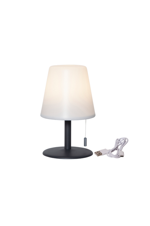 Stilren portabel bordslampa med USB för utomhusbruk. Lampan sprider ett mysigt varmvitt sken, som du kan justera till svagt eller starkt ljus, genom att dra i det hängande snöret. En fin lampa som ger en behaglig extrabelysning under ljumma sommarkvällar i trädgården eller på balkongen. Vit LED-kabel för laddning, sladdlängd 1 meter. Drivs med 1 st uppladdningsbart Li-Ion batteri. Batterier medföljer. Storlek: Total höjd 26,5 cm, bredd 16 cm, djup 16 cm. Sockel/lampa: LED. Lamporna är inte utbytbara.