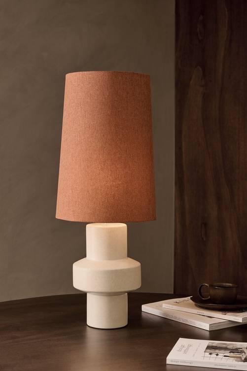 Bordslampa i retrostil med fot av glaserad keramik och en hög skärm av bomullstyg. Mått på skärmen: Höjd 43 cm, diameter toppen 25 cm, diameter botten 30 cm. Mått på lampfoten: Höjd 30 cm, diameter som störst ca 20 cm. Svart textilsladd med strömbrytare. Ljuskälla ingår ej. Tillverkningstekniken för lampfoten är unik och smås skillnader kan därför förekomma.