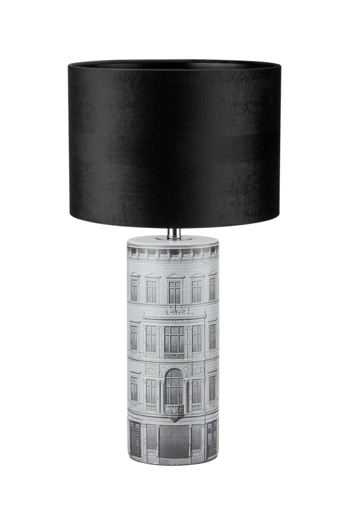 Ichi bordslampa med mönster och svart sammetsskärm. 2 meter svart textil kabel med brytare på sladd och stickkontakt. 1xE27, Max 60W.
