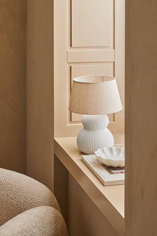 Bordslampa med fot av matt keramik med organisk form i lätt ribbstruktur. Textilskärm. Mått på skärmen: Höjd 16,5 cm, toppdiameter 21,5 cm, bottendiameter 27,5 cm. Mått på lampfoten: Höjd 23,5 cm, diameter som störst 16,5 cm. Vit textilsladd med strömbrytare. Ljuskälla ingår ej.