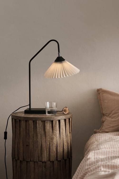 Bordslampa med fot av metall i mattsvart finish och skärm av plisserad textil. Skärmen är något riktbar i alla riktningar. Totalmått: Höjd 55 cm. Djup 38 cm. Skärmens mått: Höjd 13 cm, diameter 25 cm. Bottenplattans mått: Bredd 15 cm, höjd 3 cm, djup 18 cm. Svart sladd med strömbrytare. Ljuskälla ingår ej.