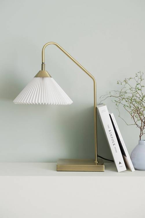 Bordslampa med fot av metall i antik mässingfinish och skärm av plisserad textil. Skärmen är något riktbar i alla riktningar. Total höjd 55 cm. Djup 38 cm. Skärmens mått: Ø 25 cm, höjd 12 cm. Bottenplattans mått: Bredd 15 cm, höjd 3 cm, djup 18 cm. Svart sladd med strömbrytare, sladdlängd 2 m. Sockel E27, max 5W. Ljuskälla ingår ej.