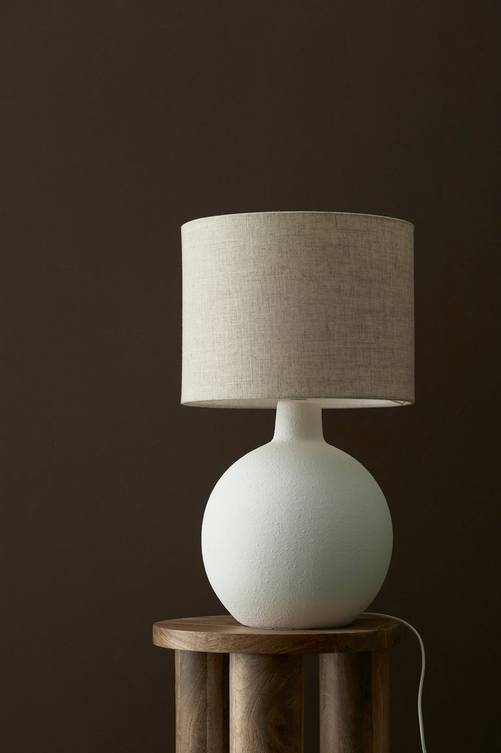 Bordslampa med fot i stengods med lätt struktur. Skärm i linnetyg. Total höjd 56 cm. Mått på skärmen: Diameter 32 cm, höjd 24,5 cm. Mått på lampfoten: Höjd 37 cm, diameter som störst 26 cm. Diameter botten 14,5 cm. Vit textilsladd med strömbrytare, sladdlängd 180 cm. Sockel E27. Max 25W. Ljuskälla ingår ej.
