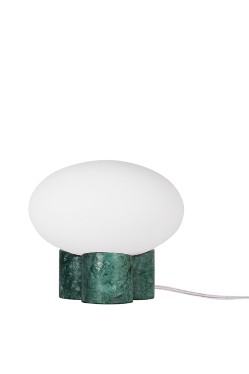 Mammut är en exklusiv och lekfull bordslampa med dess korta ben och stora glaskupa. Dess skulpturala form ger den en robust känsla och ett dekorativt utseende. Lampfoten är tillverkad av polerad och solid grön marmor med vita marmoreringar. Lampfoten matchas med en rund mattvit och tillplattad glaskupa i något överdimensionerad storlek, vilket skapar det lekfulla uttrycket. Mammut har en 200 cm lång transparent kabel med transparent brytare och stickkontakt. Design: GL Design Studio. Ljuskälla medföljer ej.
