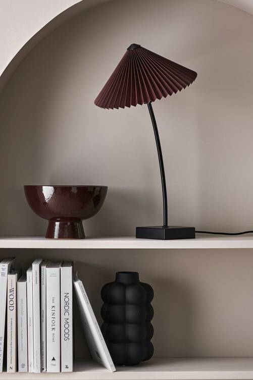 Bordslampa av metall i matt finish och plisserad skärm av papper. Total höjd 50 cm. Djup 30 cm. Skärmens mått: Ø 30 cm, höjd 15 cm. Bottenplattans mått: 28×28 cm, höjd 3 cm. Svart plastsladd med strömbrytare, sladdlängd 2 m. Sockel E14. Max 5W. Ljuskälla ingår ej.