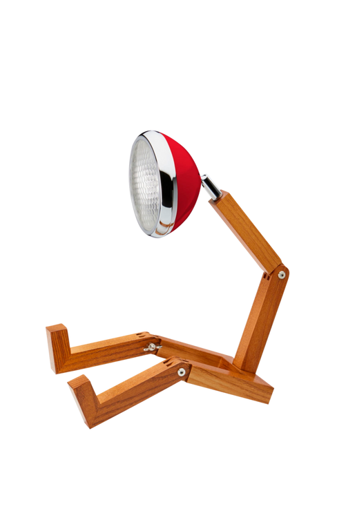 Bordslampa med design inspirerad av den ikoniska vespan och leksaksfigurer från 70-talet. Lampan är handgjord i vacker askträ. Den kraftfulla led-glödlampan lyser upp ordentligt och de 139 glasbubblorna på strålkastaren skapar en skön stämning. Lampan kan tippa om den ställs i upprätt läge. Lampan är designad att vara i sittande position. För stående position behövs lampstativ från piffany copenhagen. Mått: b 15,5 cm, d 27,6 cm, h 18-40 cm inkl 2,3 m lång bomullssladd(brun), samt en 12v g4 led glödlampa (2,5w). Adapter för stickkontakt eu och uk medföljer. Lumen 200 lm. Input voltage 100v-240v ac. Color temperature 2700 k. Color rendering(ra) >80 life expactancy 25.000 hr material: askträ/aluminium/metall